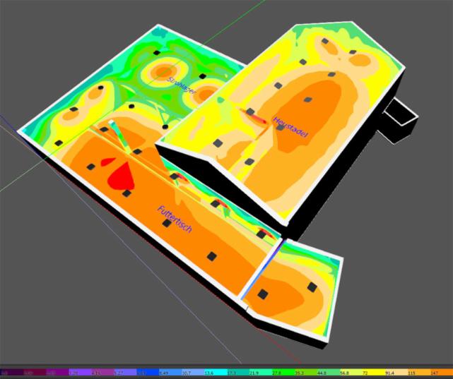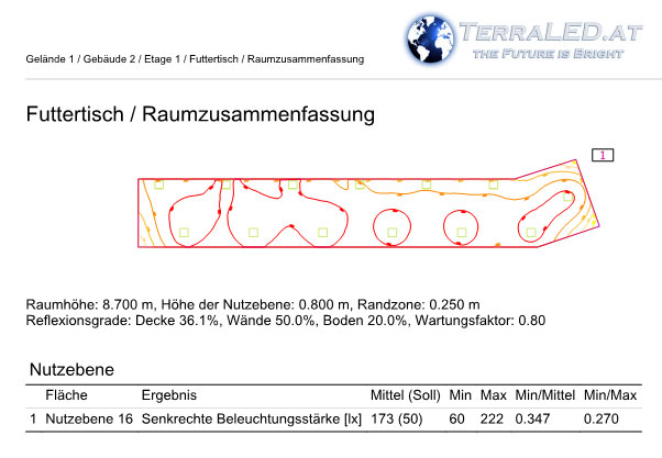Die Beleuchtung ist in einzelne Bereiche wie z.B. Futtertisch, Mistgang und Strohlager aufgeteilt. Eine Nachtbeleuchtung für die Fütterungsbereiche (Futtertisch und Kraftfutterstation) mit weniger als 20 Watt für den gesamten Stall sorgt auch nachts für ausreichend Futteraufnahme.