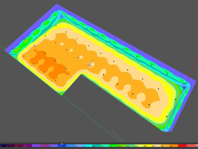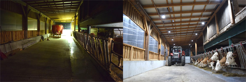 Hier das Ergebnis am Futtertisch nach der Umrüstung von 1 Stk. 400 Watt Metalldampflampe (links) auf 11 Stk. FLI-030 (rechts):